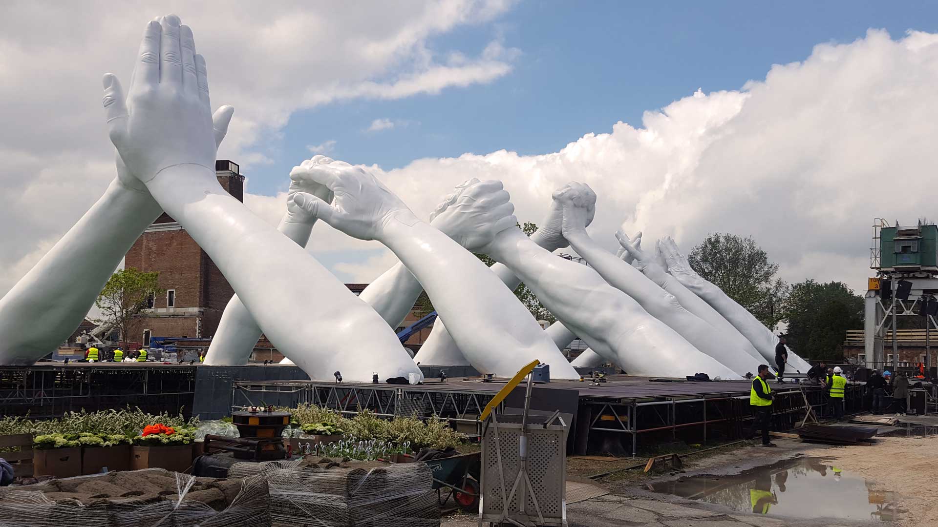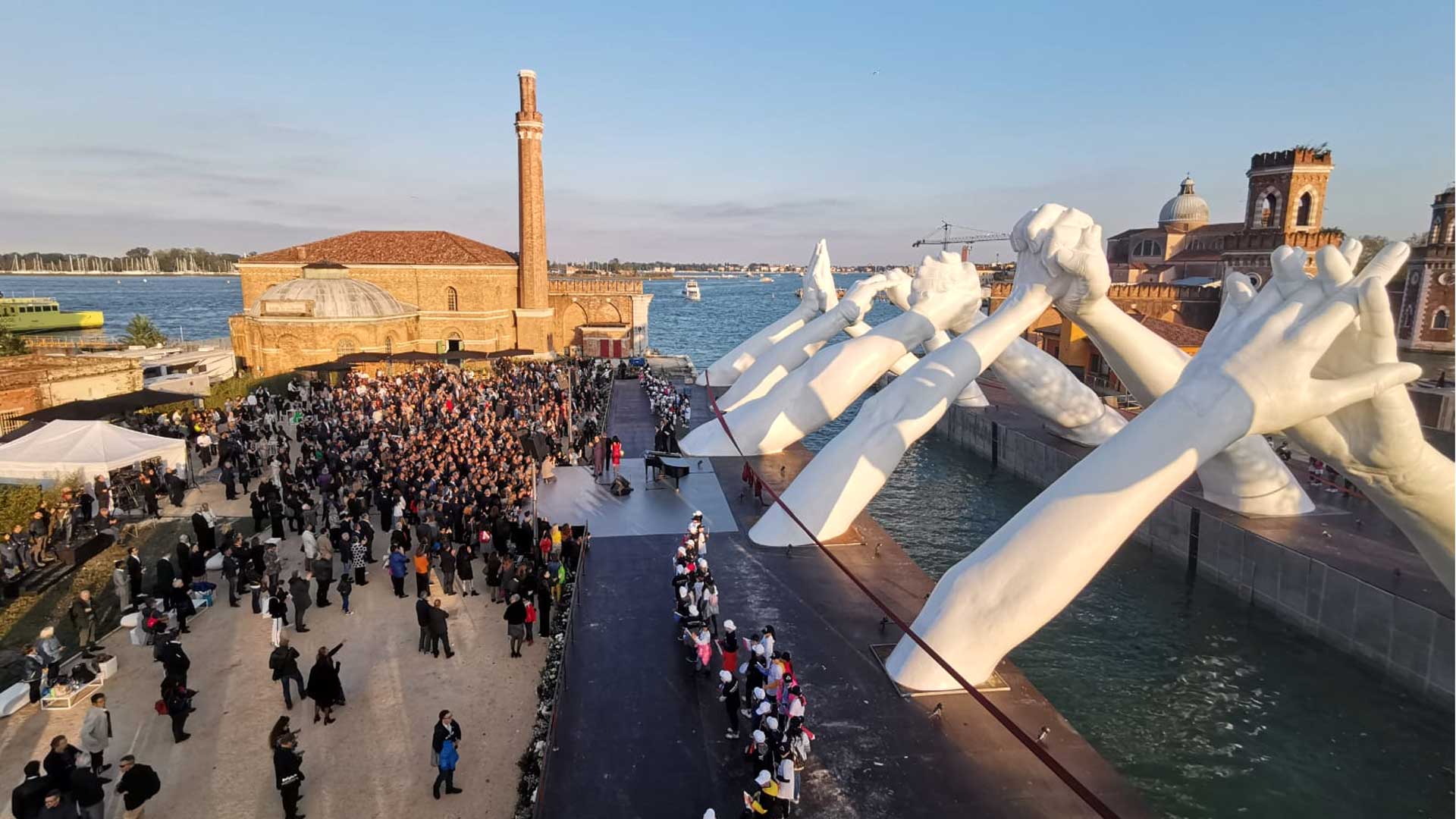 For the occasion of 2019’s Venice art biennale, Lorenzo Quinn unveils his latest work entitled ‘building bridges’. This new, site-specific sculpture comprises of six pairs of hands joining across the entrance of the Arsenale, with each pair representing one of six universally essential values: friendship, wisdom, help, faith, hope and love. The concept behind the project aims to symbolize people overcoming their differences to build a better world together. Among the guests, the mayor of Venice Luigi Brugnari, the pianist Lola Astanova and the singer Andrea Bocelli closed the presentation before the gala dinner.